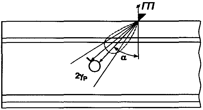 Условная протяженность дефекта | Размер в миллиметрах, соответствующий длине зоны между крайними положениями наклонного преобразователя, перемещаемого вдоль плоскости, ориентированной перпендикулярно к плоскости падения ультразвуковой волны, в пределах которой фиксируют сигнал от дефекта при заданной условной чувствительности дефектоскопа. |