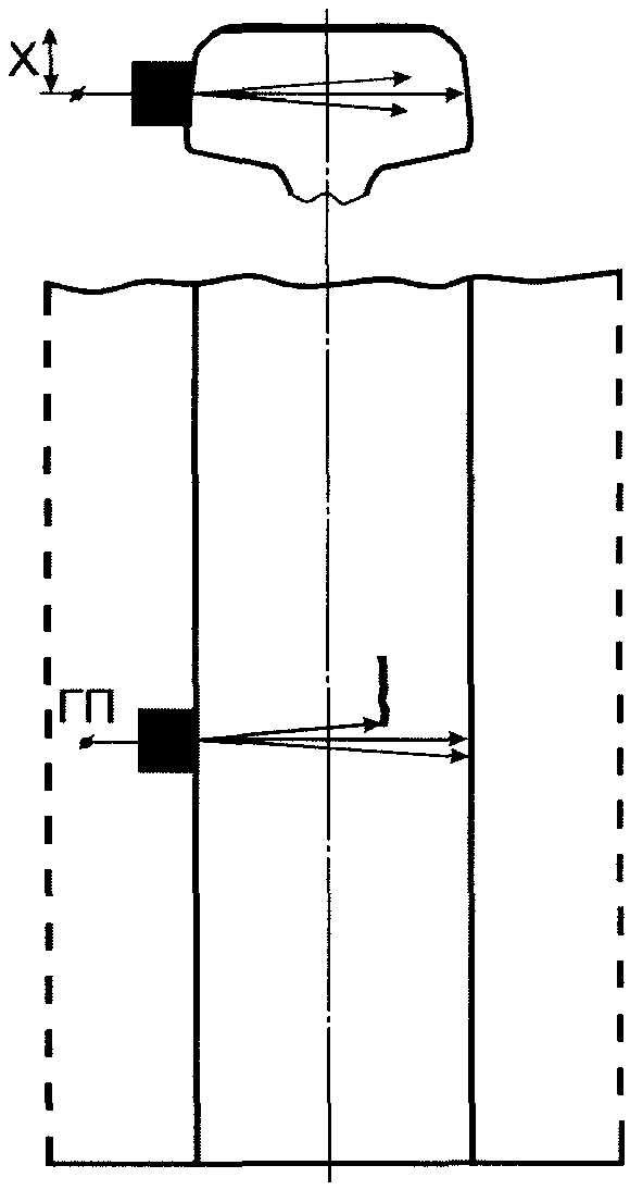 - максимальное расстояние от линии, проходящей через проекцию точки пересечения угловых отражателей, до линии, проходящей перпендикулярно к поверхности Б через середину (точку ввода луча) преобразователя, установленного в положение, при котором задний фронт первого эхо-сигнала еще пересекается с передним фронтом второго эхо-сигнала от угловых отражателей на уровне линии развертки, мм;