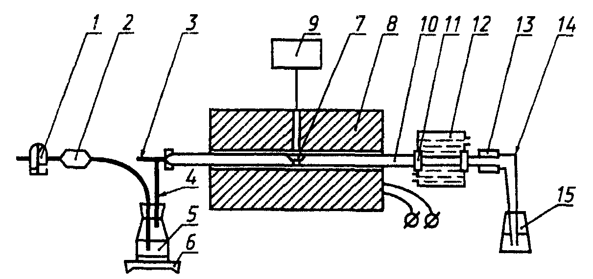 Навеску флюса массой 0,1 - 0,2 г помещают в фарфоровую лодочку, содержащую 0,2 - 0,4 г оксида алюминия. Содержимое лодочки тщательно перемешивают. Лодочку помещают в фарфоровую трубку, нагретую до температуры 1250 - 1350 °С, и закрывают трубку резиновой пробкой. В фарфоровую трубку через отросток трубки 3 подают воздух или кислород со скоростью 3 - 5 пузырьков в секунду одновременно с водяным паром.