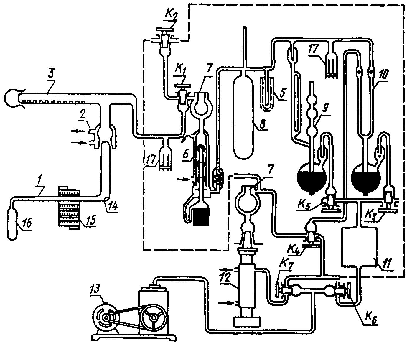 калиброванной емкости, ограниченной с одной стороны условной средней линией стеклянного парортутного насоса, с другой стороны - ртутным затвором 10. Экстрагированный из образца газ перекачивается в калиброванную емкость, включающую баллон 8, стеклянным парортутным насосом 6;
