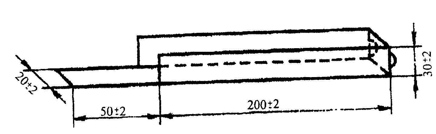 3.2.2.3. Пробе герметизирующего материала придают форму валика диаметром 30 - 35 мм и длиной не менее 50 мм, помещают на середину подложки и обжимают с двух сторон ограничительными планками. Во избежание прилипания герметизирующего материала к планкам они должны быть со стороны, примыкающей к герметизирующему материалу, смазаны индустриальным маслом и присыпаны наполнителем, применяемым для изготовления герметизирующего материала. Сверху пробу прижимают второй подложкой для придания ей формы прямоугольного параллелепипеда с размером поперечного сечения [(30 х 20) +/-2)] мм и длиной, равной длине подложки. Избыток герметизирующего материала удаляют ножом со сторон, не ограниченных планками.
