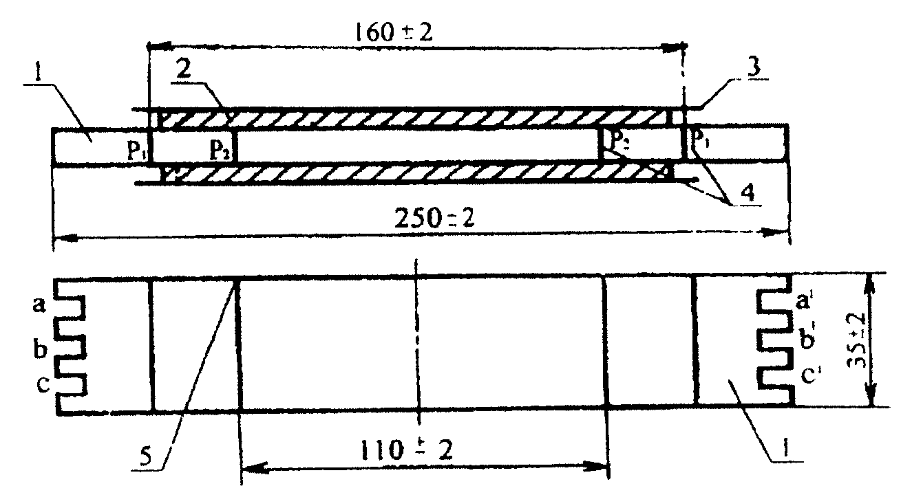 Подложки (2 шт.) в виде призмы длиной и шириной (50 + 2) мм и толщиной, обеспечивающей сохранение формы подложек в процессе изготовления и испытания образца. Масса одной подложки не должна превышать 170 г. Материал подложки указывают в нормативных документах на конкретный вид герметизирующего материала.