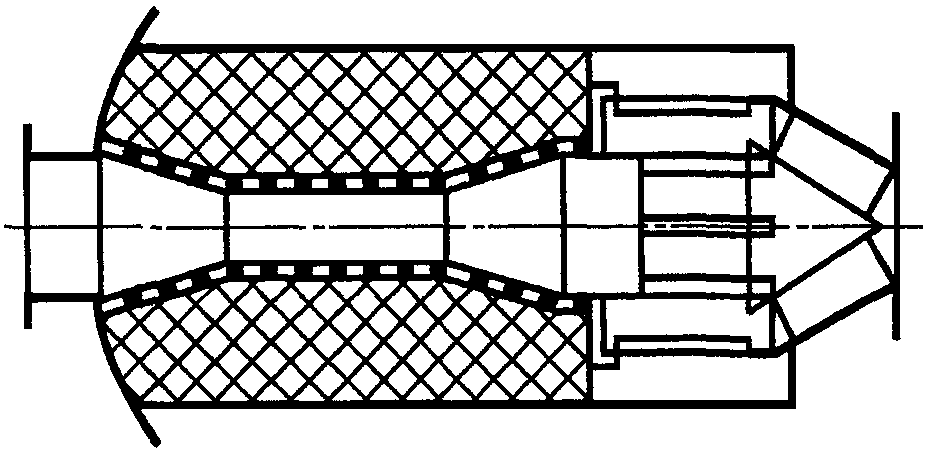 рисунке G.1, аэродинамический просвет рупора определяется внутренней оболочкой, выполненной из перфорированного металлического листа с коэффициентом перфорации около 35%. Объем между перфорированным листом и цилиндрической секцией оболочки рупора заполняется пористым звукопоглощающим материалом.