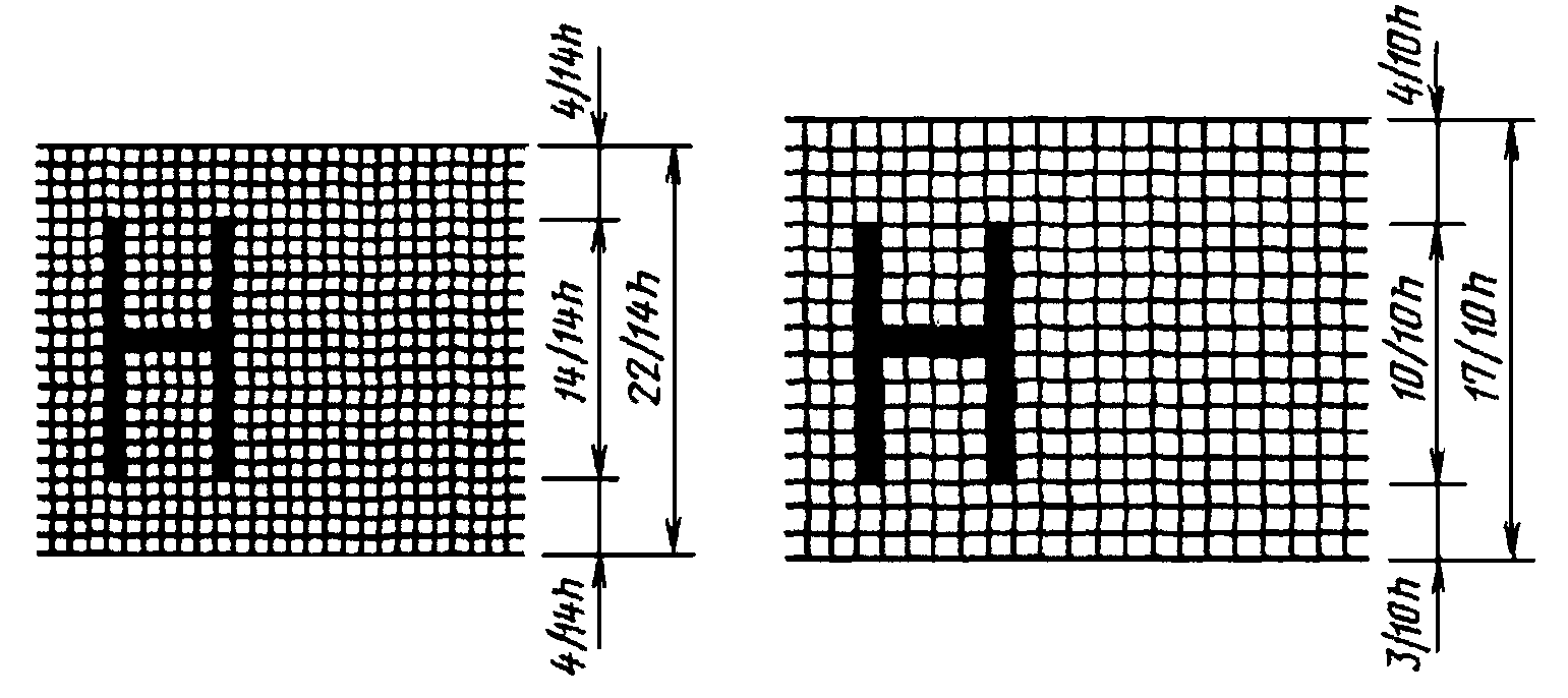 высота прописных букв | h | (10/10)h | 10d | 1,8 | 2,5 | 3,5 | 5,0 | 7,0 | 10,0 | 14,0 | 20,0 |
