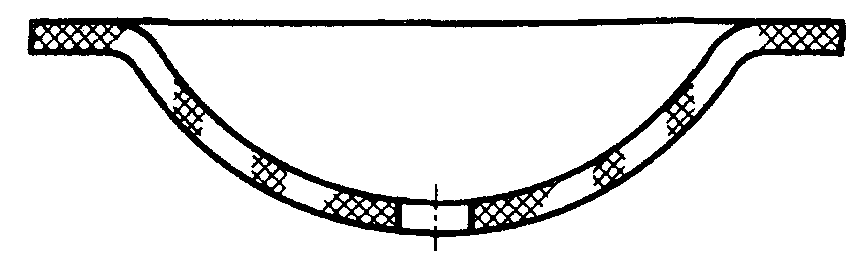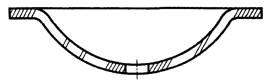 7. Узкие и длинные площади сечений (например, штампованных, вальцованных и других подобных деталей), ширина которых на чертеже от 2 до 4 мм, допускается штриховать полностью только на концах и у контуров отверстий, а остальную площадь сечения - небольшими участками в нескольких местах (черт. 5 и