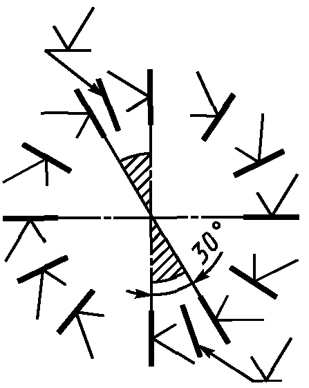 Высота знака условного обозначения направления неровностей должна быть приблизительно равна h. Толщина линий знака должна быть приблизительно равна половине толщины сплошной основной линии.