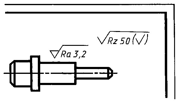 Размеры и толщина линий знака в обозначении шероховатости, вынесенном в правый верхний угол чертежа, должны быть приблизительно в 1,5 раза больше, чем в обозначениях, нанесенных на изображении.
