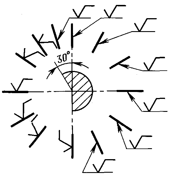 Обозначения шероховатости симметрично расположенных элементов симметричных изделий наносят один раз.