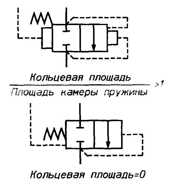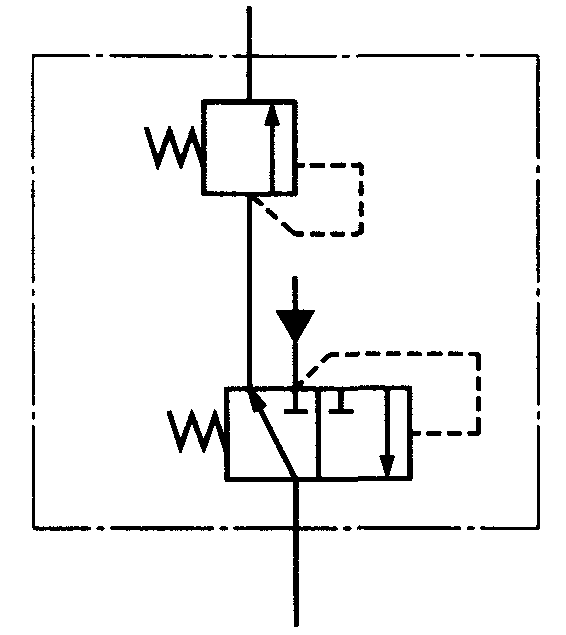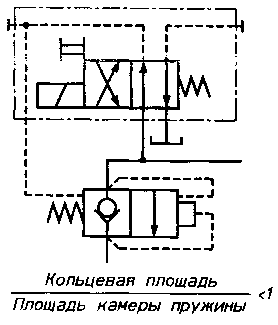 Основная ступень. Двухлинейный, двухпозиционный распределитель, одна линия управления совмещена с камерой кольцевой поверхности, другая линия управления сообщена с камерой дифференциальной поверхности, пружинный возврат, срабатывающий от сброса давления управления | ![]() | |