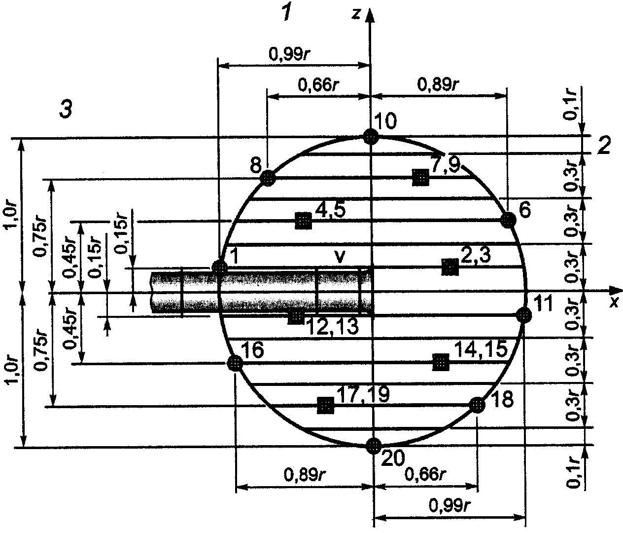 - в точках 7, 8 и 9 в вертикальной плоскости.