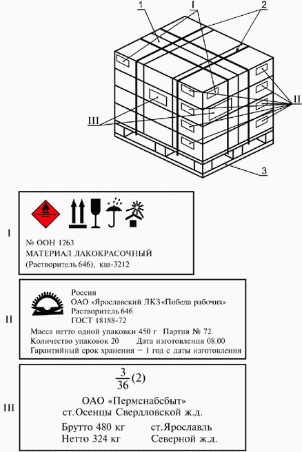 характеризующая продукцию; 1 - ящик, 2 - лента, 3 - поддон