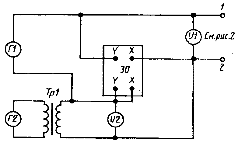 Генератор Г2 настраивают на частоту, кратную номинальной частоте генератора Г1 на 3-ю гармонику. При отключенном генераторе Г1 устанавливают по вольтметру U2 напряжение, равное процентному содержанию гармоники относительно номинального напряжения испытуемого прибора (