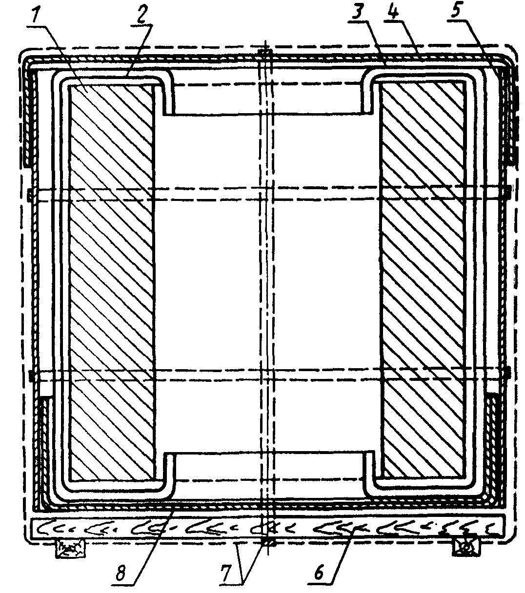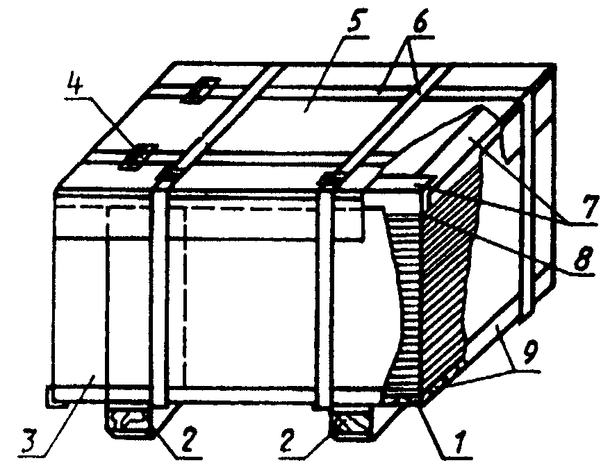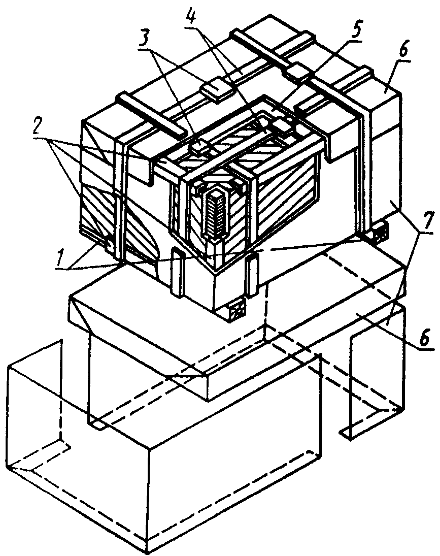 На все ребра пачки накладывают металлические уголки 2, после чего пачку скрепляют двумя продольными и двумя поперечными упаковочными лентами 4. Затем на боковые стороны скрепленной пачки надевают разъемный кожух 7, изготовленный из тонколистовой стали, сверху закрывают металлической крышкой 6 и вновь скрепляют двумя поперечными и двумя продольными упаковочными лентами при помощи замков 3.