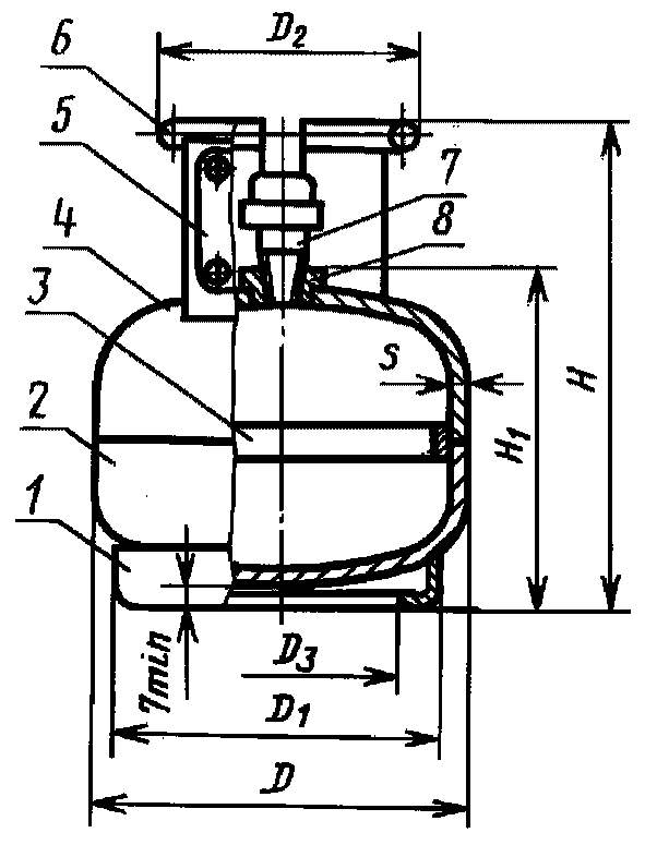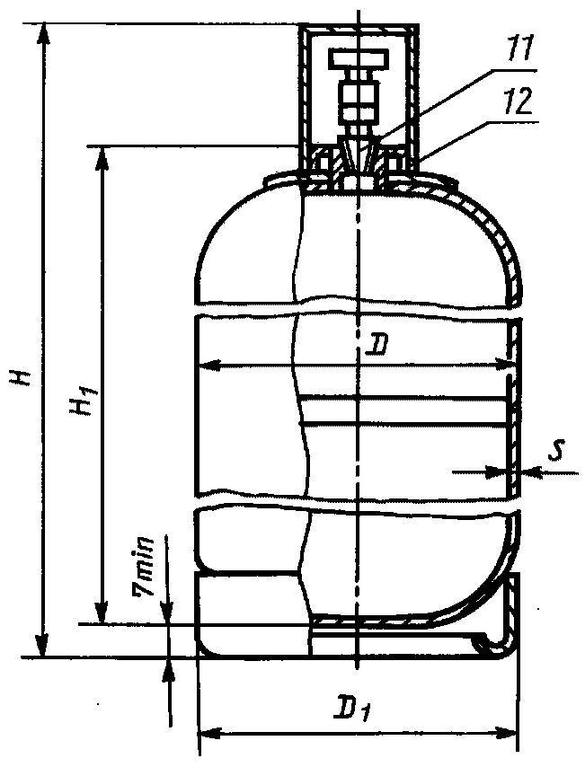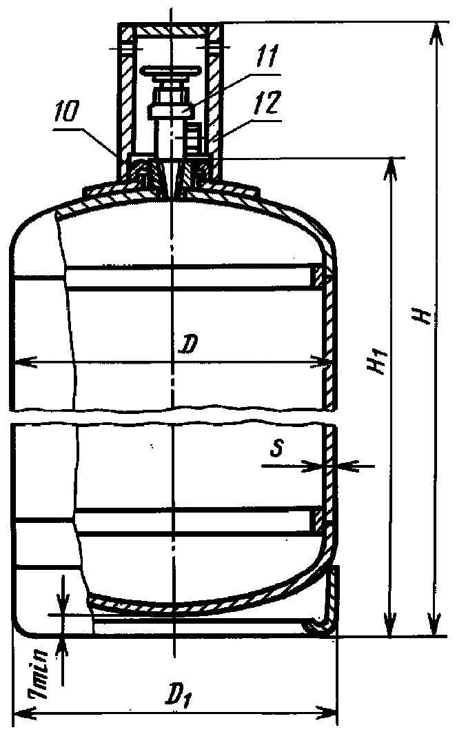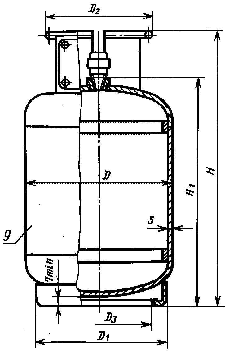 Объем, л, не менее | s | D | D1 | D2 | D3 | Н1, не более | H, не более | Масса сжиженного газа (пропана), кг, не более | Масса порожнего баллона, кг |