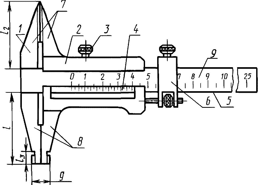 Примечание. Допускается оснащать штангенциркули приспособлениями или вспомогательными измерительными поверхностями для расширения функциональных возможностей (измерения высот, уступов и др.).