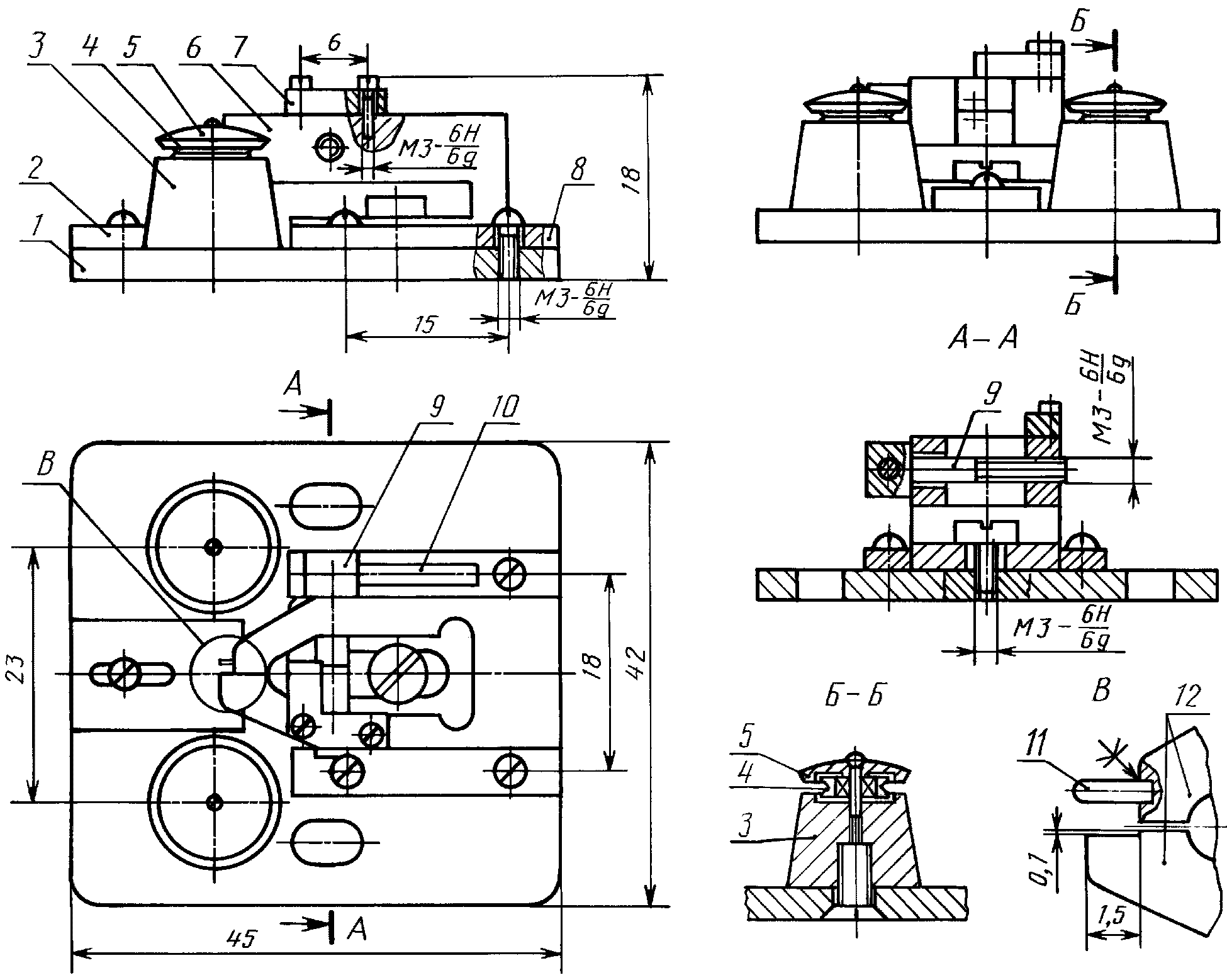 9 - винт; 10 - ручка; 11 - направляющая; 12 - струбцины