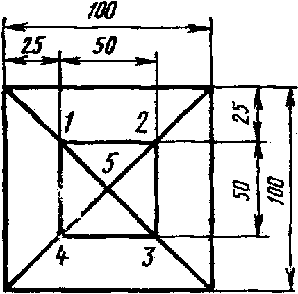 3.2.2. Толщину образца измеряют в пяти точках, указанных на черт. 3, с погрешностью не более 0,01 мм.