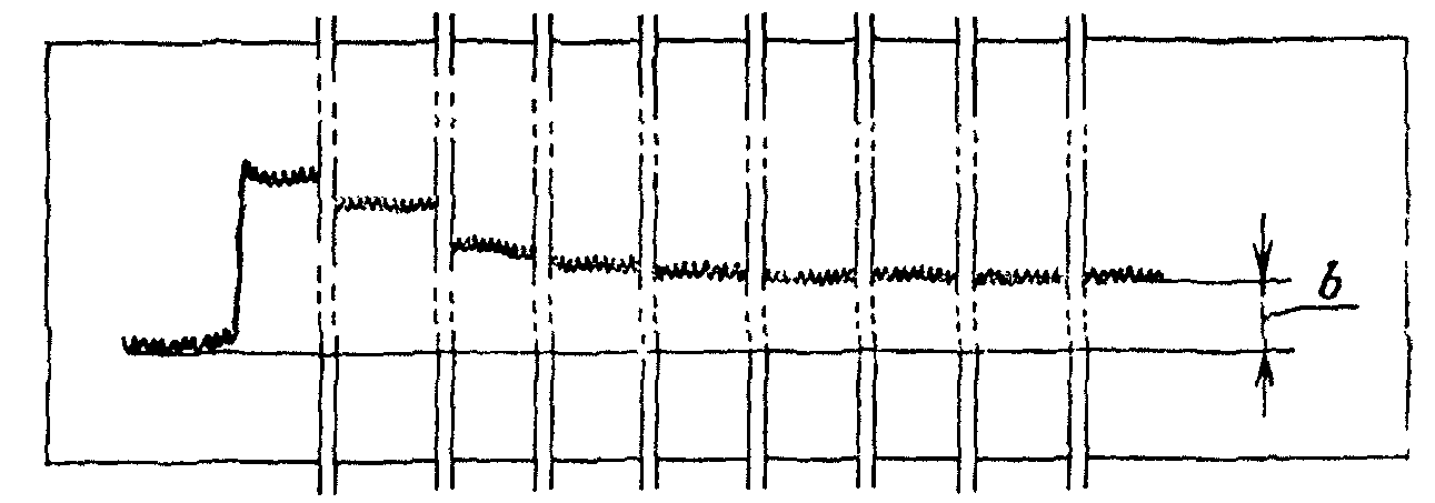 4.5. Запись силы трения при испытании производят сначала непрерывно, а затем периодически одновременно с записью линейного износа. Прибор, регистрирующий силу трения с целью записи линии начала отсчета, включают за 1 мин до включения привода испытательной установки. Пример записи прибора, периодически регистрирующего силу трения, приведен на черт. 6.