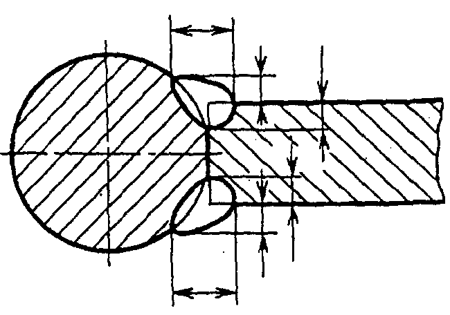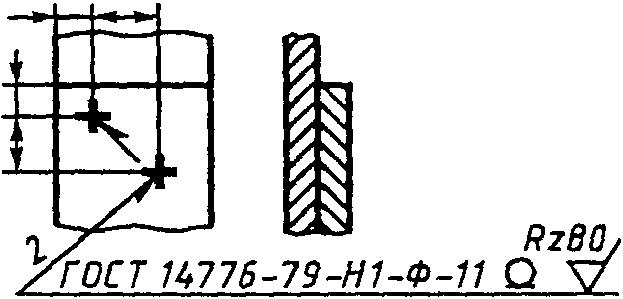 Одиночные сварные точки соединения внахлестку, выполняемые дуговой сваркой под флюсом. Диаметр электрозаклепки 11 мм. Усиление должно быть снято. Параметр шероховатости обработанной поверхности Rz 80 мкм | | | - |