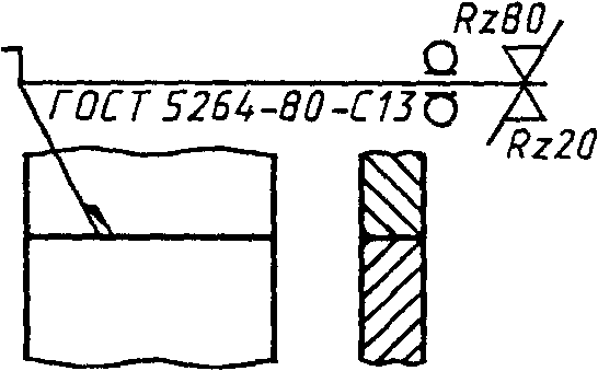 2.5. Обозначение шероховатости механически обработанной поверхности шва наносят на полке или под полкой линии-выноски после условного обозначения шва (черт. 8), или указывают в таблице швов, или приводят в технических требованиях чертежа, например: "Параметр шероховатости поверхности сварных швов...".