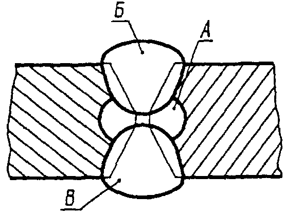 1.2. На изображение сечения многопроходного шва допускается наносить контуры отдельных проходов, при этом их необходимо обозначать прописными буквами русского алфавита (черт. 3).