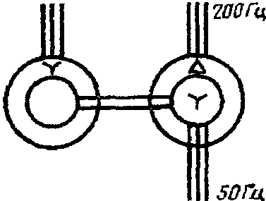 53. Агрегат, состоящий из асинхронного трехфазного двигателя с короткозамкнутым ротором и преобразователя частоты (например, 50/200 Гц); обмотки статора двигателя и ротора преобразователя соединены в звезду, обмотка статора преобразователя - в треугольник | ![]() | - |