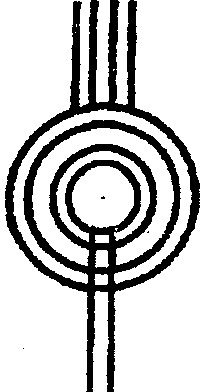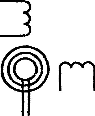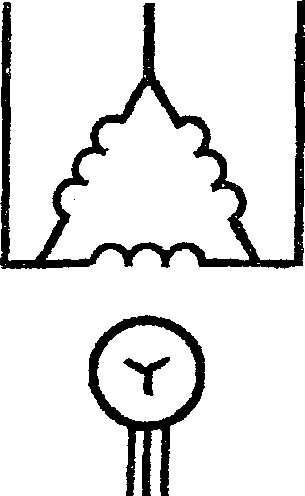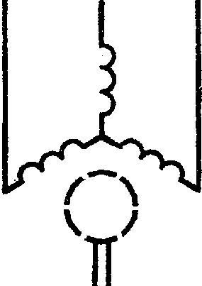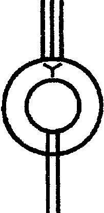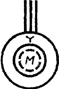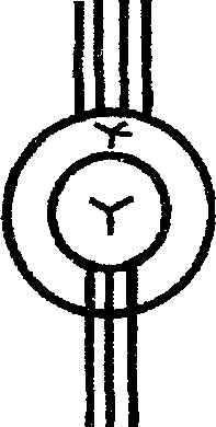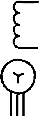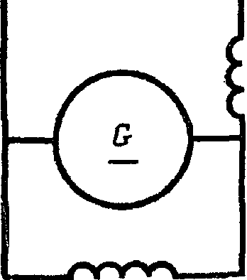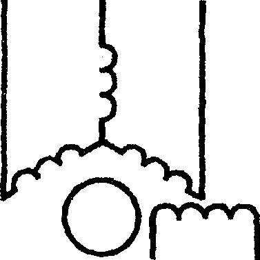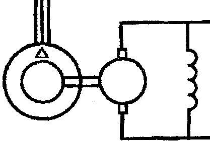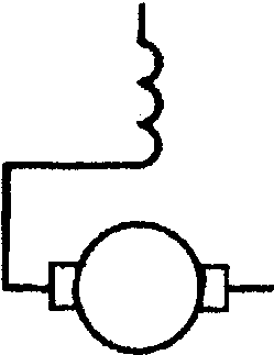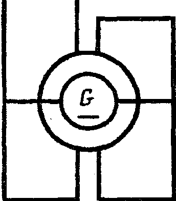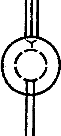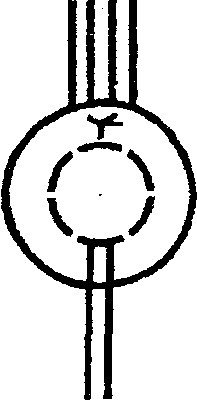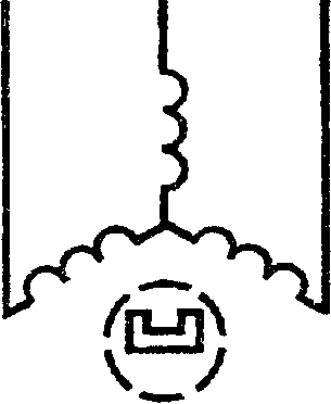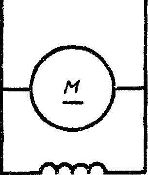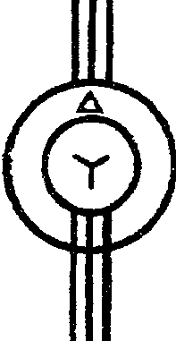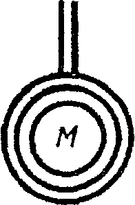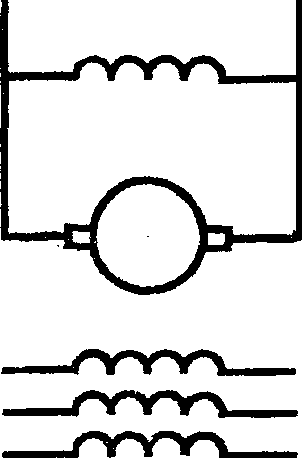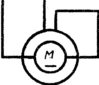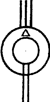31. Двигатель коллекторный трехфазный параллельного возбуждения с питанием через ротор с двойным рядом щеток. Две окружности, соединенные короткими параллельными линиями, изображают две обмотки одного и того же ротора | ![]() | ![]() |