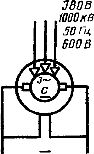 47. Преобразователь синхронный трехфазный с параллельным возбуждением, с указанием зажимов, щеток и числовых данных, например, 600 В, 1000 кВ, 50 Гц | ![]() | ![]() |