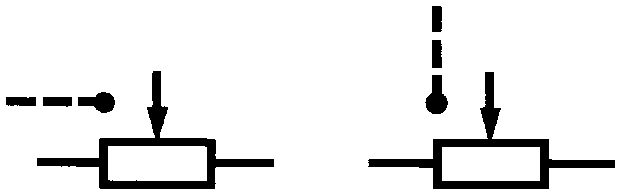 Примечания: 1. Линии, изображающие дополнительные отводы, должны делить длинную сторону обозначения на отрезки, приблизительно пропорциональные линейным (или угловым) размерам соответствующих участков потенциометра. 2. Линия, изображающая подвижный контакт, должна занимать промежуточное положение относительно линий дополнительных отводов. | |