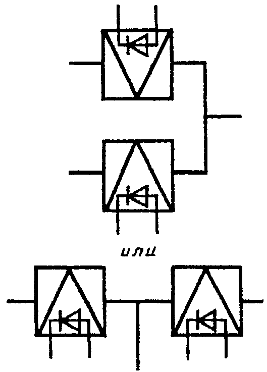 Примечания: 1. Допускается указывать величину затухания в открытом (числитель) и закрытом (знаменатель) состояниях. 2. При необходимости внутри обозначения модулятора показывают схему соединений полупроводниковых диодов. При этом размеры прямоугольника допускается соответственно увеличивать. 3. Обозначения вписываемых диодов должны соответствовать требованиям ГОСТ 2.730-73. |