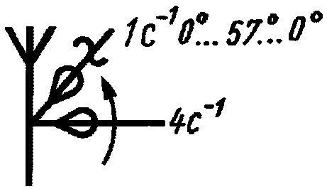 к) антенна приемо-передающая с вращением в горизонтальной и качанием в вертикальной плоскостях (с вращением по азимуту и качанием по высоте), например, со скоростью вращения 4S-1 и качанием на угол от 0 до 57° за секунду | ![]() |