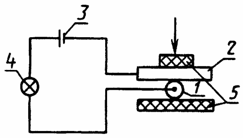 Между пластинками помещают взаимно перпендикулярно образец провода и металлический брусок. Защищенный конец провода и брусок соединяют с батареей и лампочкой. Нагрузку на образец подают до замыкания электрической цепи (до загорания лампочки) и ее величину фиксируют силоизмерителем машины. На каждом образце производят 5 - 6 измерений.