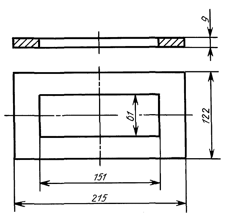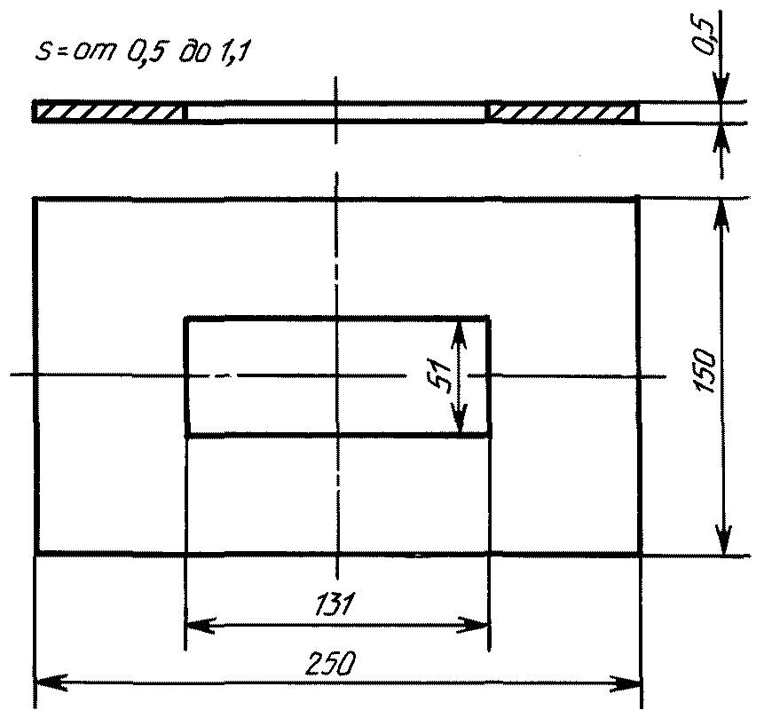 Подготовленную пластинку плотно зажимают между плитой и трафаретом при помощи рамки и упорных барашков и металлическим шпателем наносят на нее шпатлевку до краев трафарета, снимая избыток. Размер выреза в трафарете - 50 x 130 мм.
