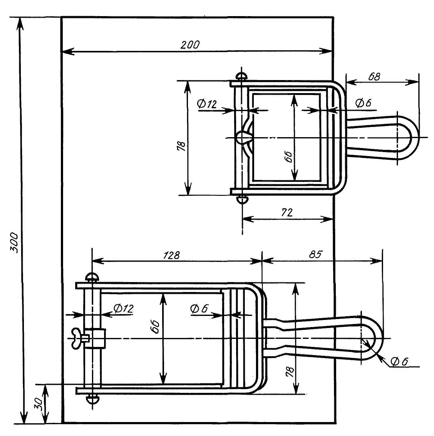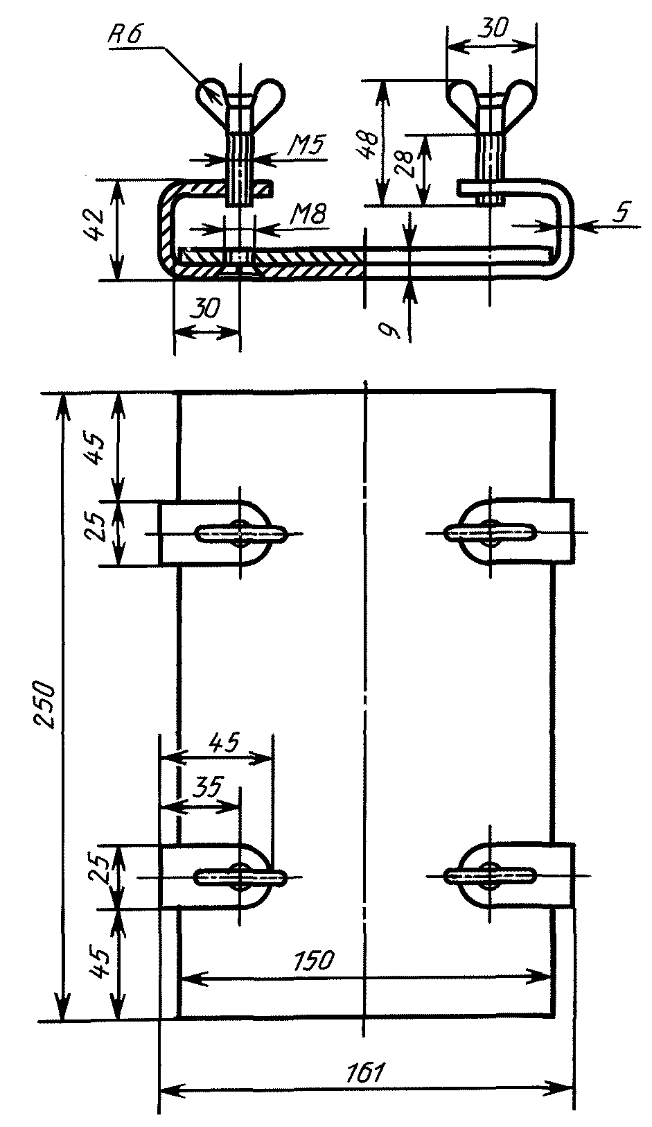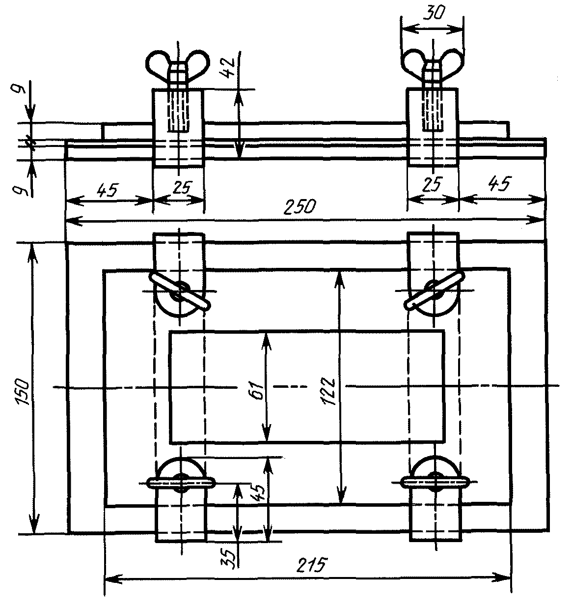 4) состоит из стальной плиты, к которой прикреплены четыре скобы с упорными барашками, прижимной стальной рамки и металлических трафаретов различной толщины. Поверхности плиты и рамки должны быть пришлифованы.