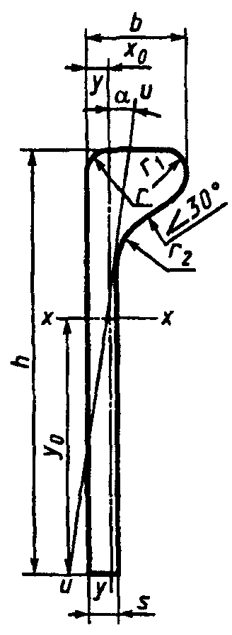 Номер полособульба | h | b | s | r, r1, r2 | Площадь сечения полособульба, см2 | Теоретическая масса 1 м профиля, кг | Справочная величина для осей | Угол наклона оси u - u | Координаты центра тяжести |