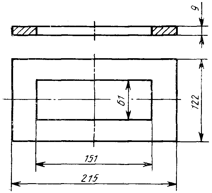 Подготовленную пластинку плотно зажимают между плитой и трафаретом при помощи рамки и упорных барашков и наносят на нее шпатлевку металлическим шпателем до краев трафарета, снимая избыток. Размер выреза в трафарете 50 х 130 мм.