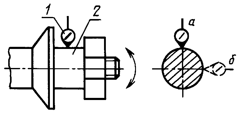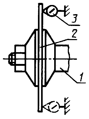 Пильный вал устанавливают в крайнее положение. На неподвижной части станка устанавливают стойку с индикатором 3 так, чтобы его измерительный наконечник касался боковой поверхности контрольного диска в точке, наиболее удаленной от оси, и был направлен перпендикулярно к ней.