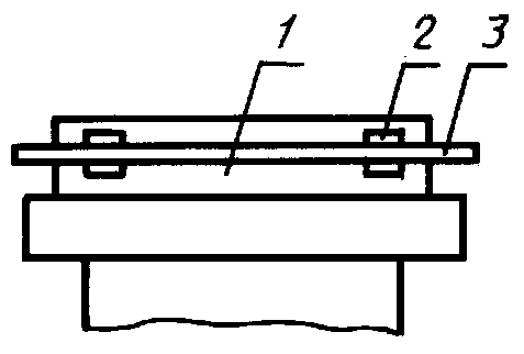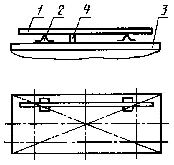 На рабочей поверхности направляющей линейки 1 в продольном направлении на двух опорах 2 одинаковой высоты (плоскопараллельных концевых мерах длины) прикладывают рабочей поверхностью поверочную линейку 3.