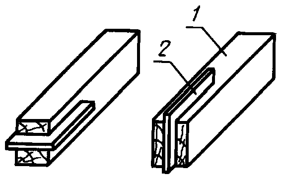 На станке распиливают образец 1, базируя строганую пласть его по столу станка, а строганую кромку - по направляющей линейке.