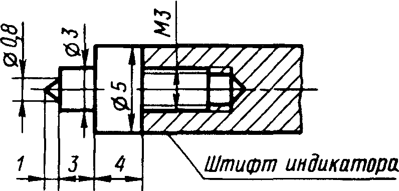 ГОСТ 577, с погрешностью измерения не более 0,01 мм. Прибор включает две стойки, смонтированные на общей подставке. На одной из стоек укреплен индикатор, на другой - неподвижный штифт. Наконечники штифта индикатора (черт. 1) и неподвижного штифта представляют собой острия длиной 1,0 мм и диаметром основания 0,8 мм с заплечиками высотой 1,1 мм.
