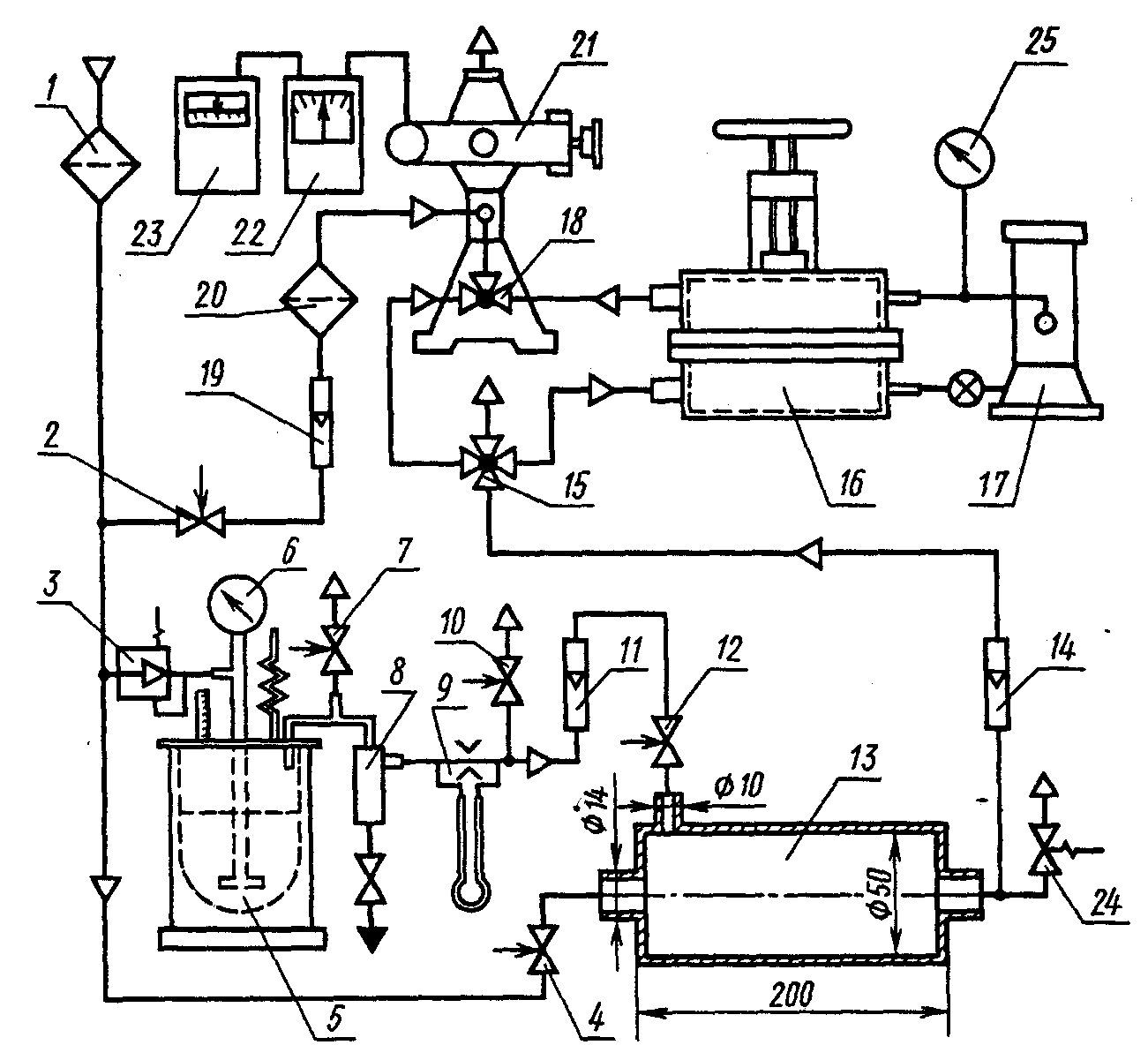 8 - фильтр-отделитель; 9, 11, 14 - реометры с верхним