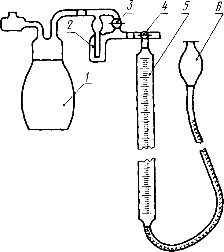 кран; 5 - бюретка; 6 - уравнительная склянка
