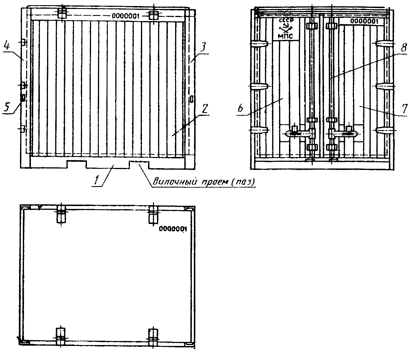 2.3. Контейнер должен собираться из следующих элементов: двух боковых стенок в сборе с рымными узлами для стропов или захватов кранов, торцевой стенки в сборе, дверной рамы, двух створок со штанговыми запорными устройствами, настила пола, поперечных балок верхней и нижней рам и кровли крыши. Компоновка основных элементов конструкции должна соответствовать чертежу.