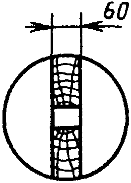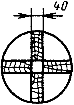 Допускается выпиливать заготовки из кряжа диаметром не более 180 мм в виде сердцевинных досок толщиной не менее 40 мм по направлению двух взаимно перпендикулярных диаметров (черт. 2). В этом случае при необходимости изготовления образцов с размерами поперечного сечения более 40 мм от кряжей перед выпиловкой сердцевинной доски должны быть отпилены отрезки длиной не менее 100 мм, которые раскраивают в соответствии с черт. 1.