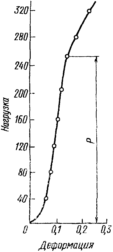 4.1. Для определения нагрузки P по результатам измерений вычерчивают диаграмму смятия поперек волокон, подобную изображенной на черт. 2. За нагрузку P принимают ординату точки перехода прямолинейного или близкого к прямолинейному участка диаграммы в явно криволинейный. Масштаб диаграммы по оси ординат должен быть не менее 50 Н/мм, чтобы обеспечить определение нагрузки P с погрешностью не более 50 Н.