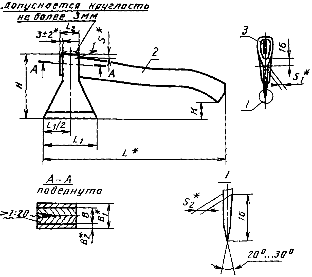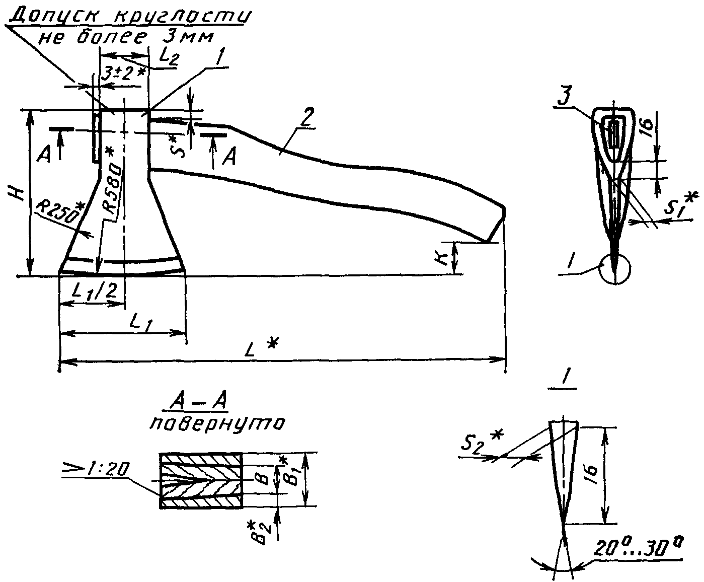 1.2.13. Допуск симметричности поверхности всада и поверхности полотна топора относительно общей плоскости симметрии - 2 мм.
