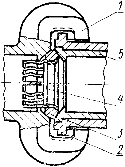 1, 2 - гайки; 3 - кольцо; 4 - втулка; 5 - штуцер