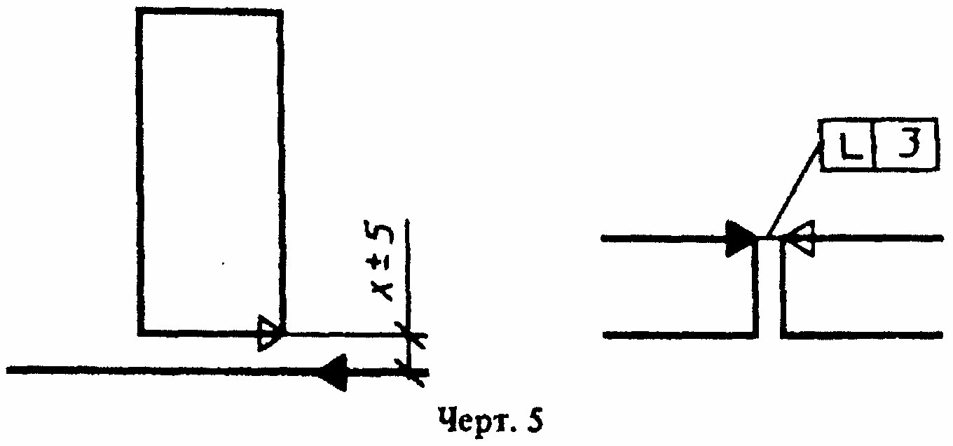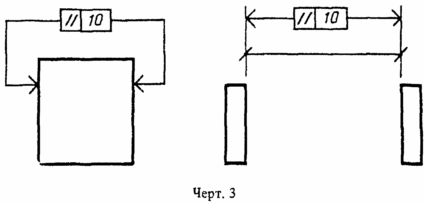 2.7. Характеристики точности ориентации двух граней или поверхностей элементов в случаях, когда ни одна из них не является базой, указывают в рамке с соединительной линией, заканчивающейся стрелками (черт. 3). Если нет специальных указаний, требование распространяется на всю длину элементов.