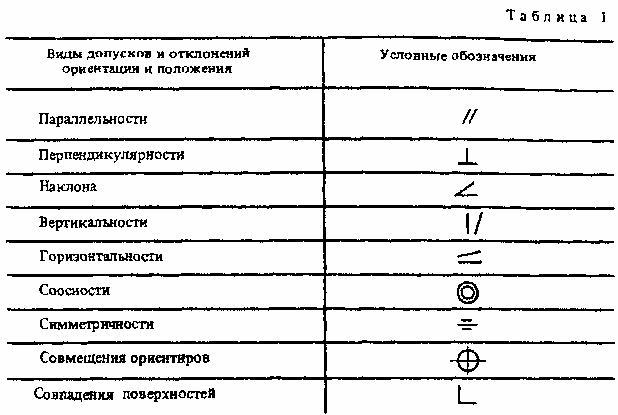 2.2. Характеристики точности ориентации (взаимного положения) поверхностей (например, их точек, линий, ребер, граней) одного или двух элементов либо элемента относительно заданного направления указывают числовыми значениями допусков или предельных отклонений с условными обозначениями по табл. 1.
