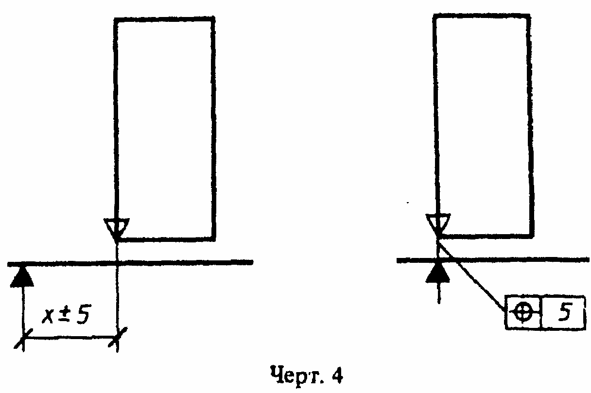 2.4. Характеристики точности высотного положения и положения в плане элемента или конструкции (например, их точек, граней, поверхностей) относительно базы (например, разбивочного ориентира, плоскости, грани, точки, отметки) указывают числовыми значениями предельных отклонений от номинального значения геометрического параметра, определяющего расстояние между элементом и базой в соответствии с черт. 1.